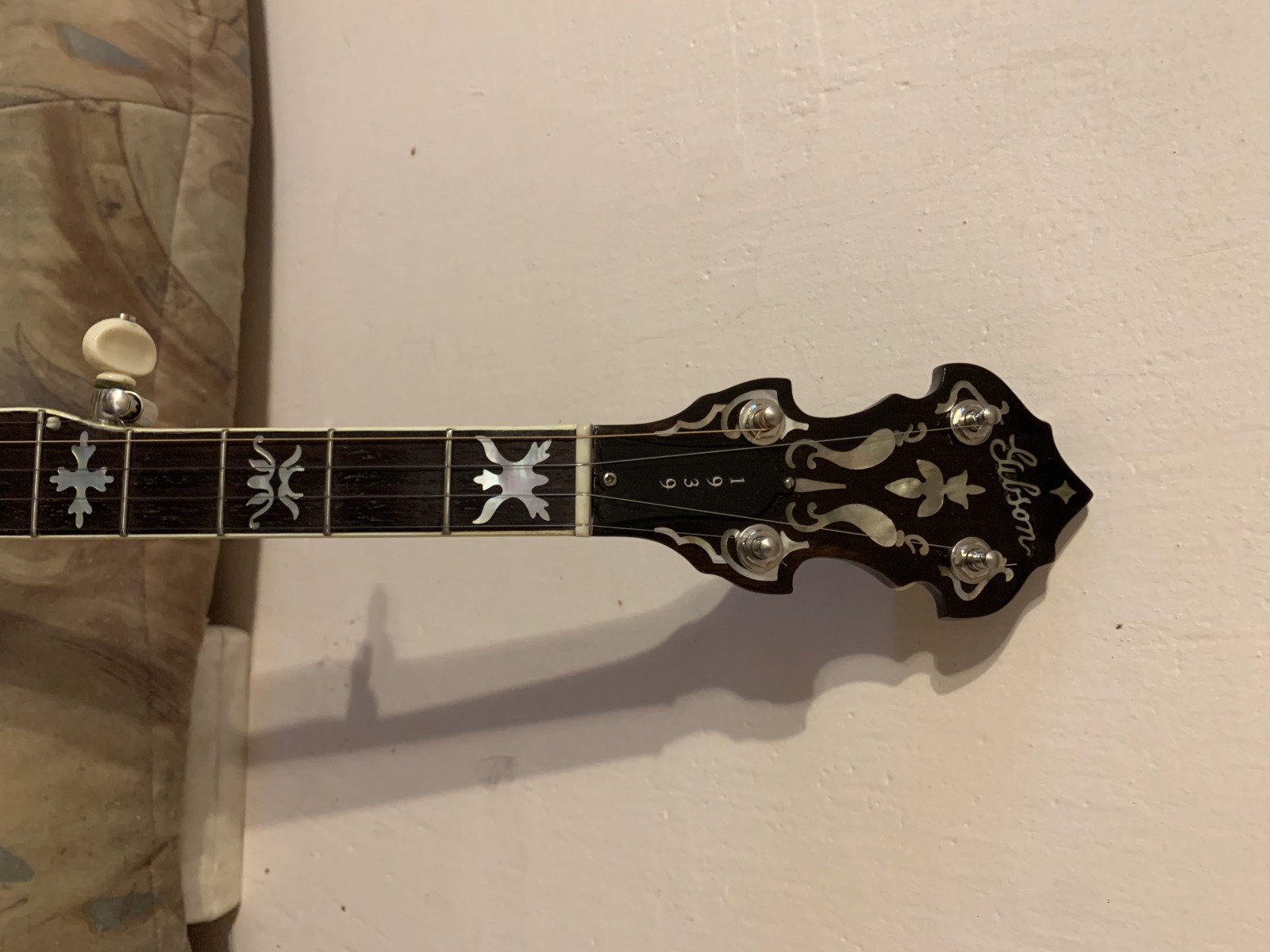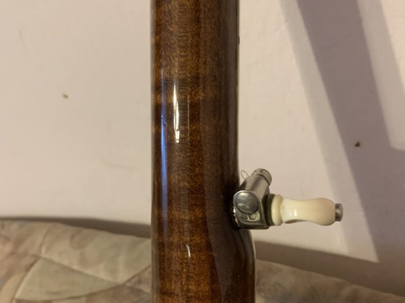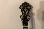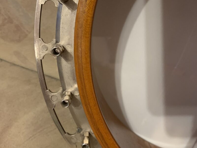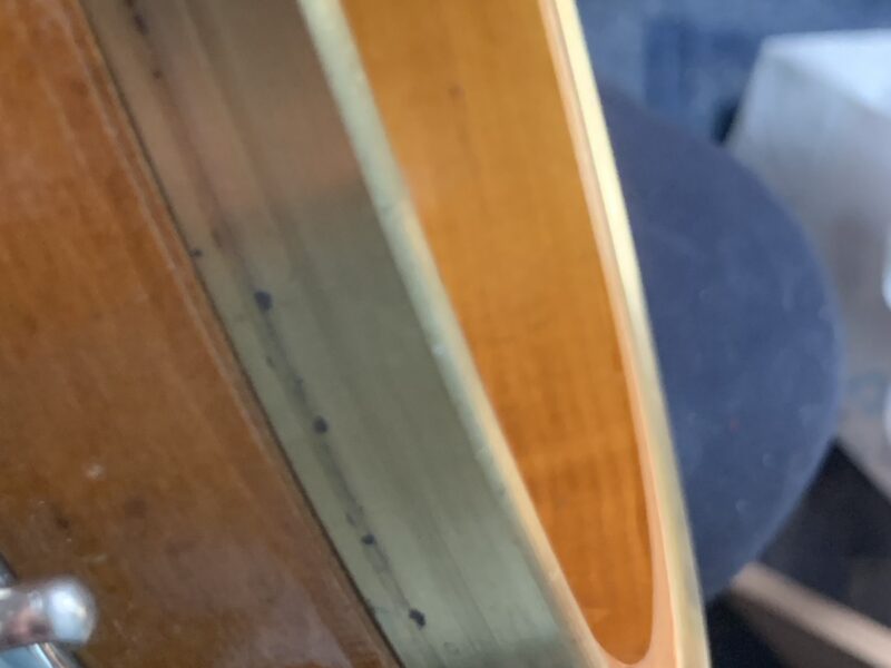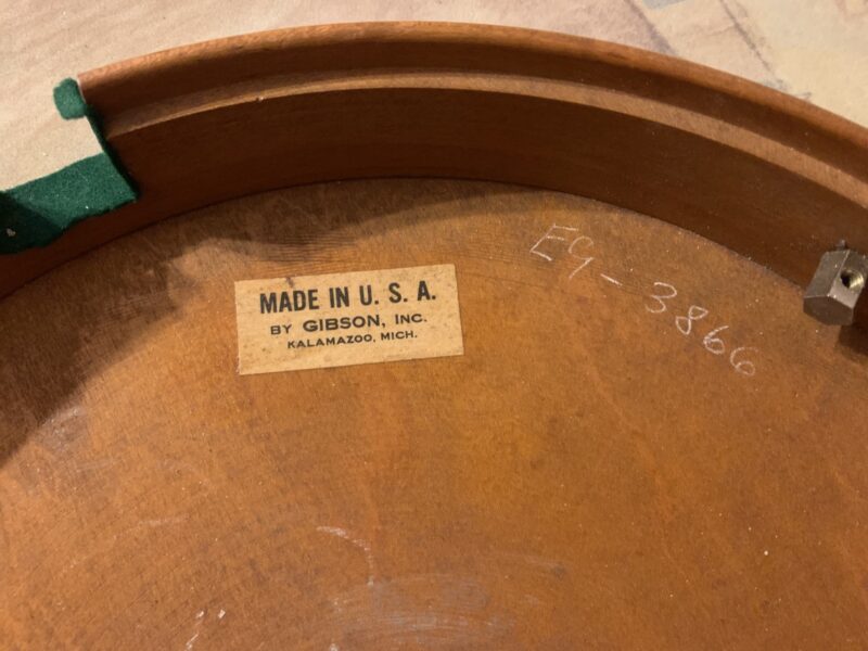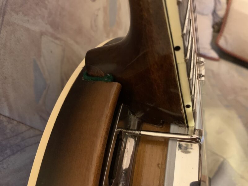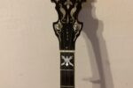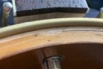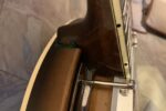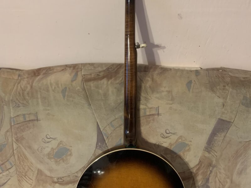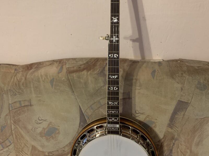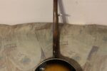 Nabízím k prodeji banjo Gibson RB-00. (Předválečná konverze). Původní přítlačný prstenec blány byl nahrazen modernějším od Zdeňka Roha, což přispělo k lepší stabilitě struníku. (Původní struník na úzkém přítlačném prstenci byl velmi nestabilní). Tonering je Rolled Brass Hoop / tone ring s krátkou“sukní“. (Viz foto). Můstek od Tima Purcella, struník Clamshell, Tvůrce krku je neznámý, ale velmi povedený! Vykládání krku klasické – Flying Eagle…Háčky pro pátou strunu na 7. a 9.  pražci. Blána je Remo Weather King. Ráfek resonátor a flange jsou původní.
