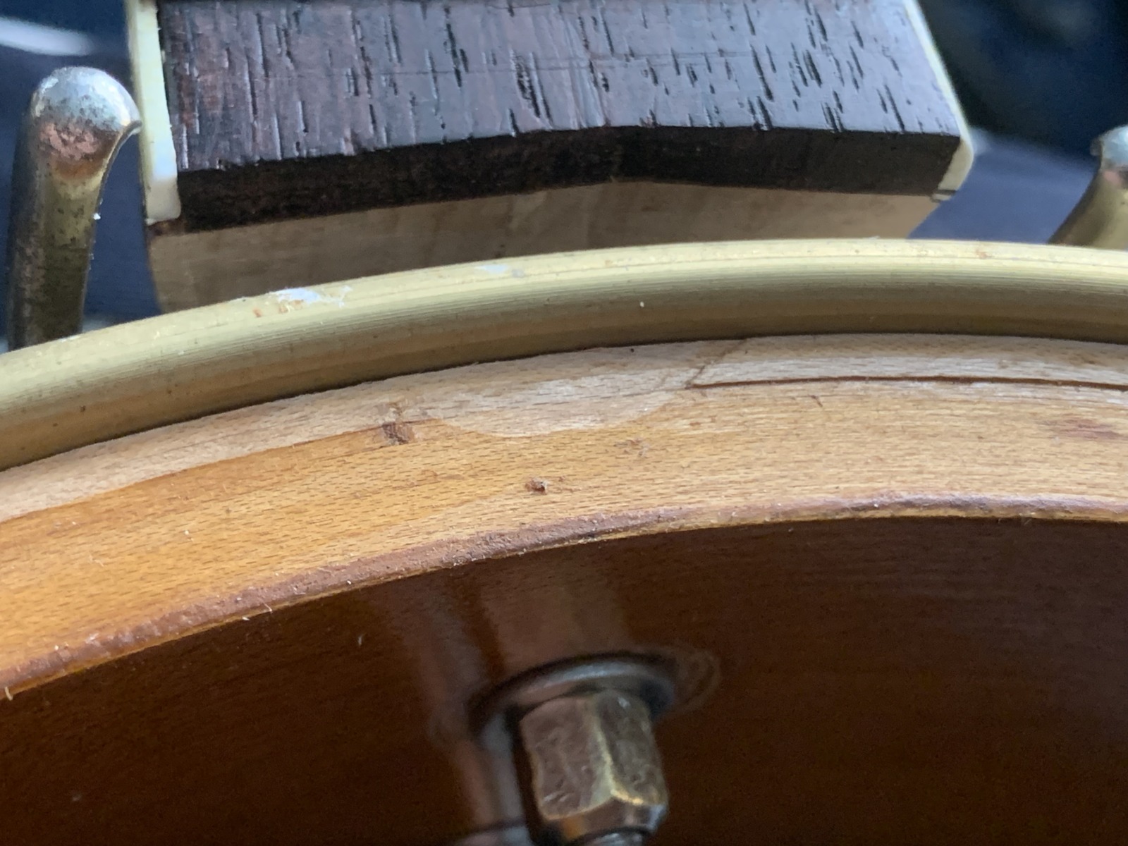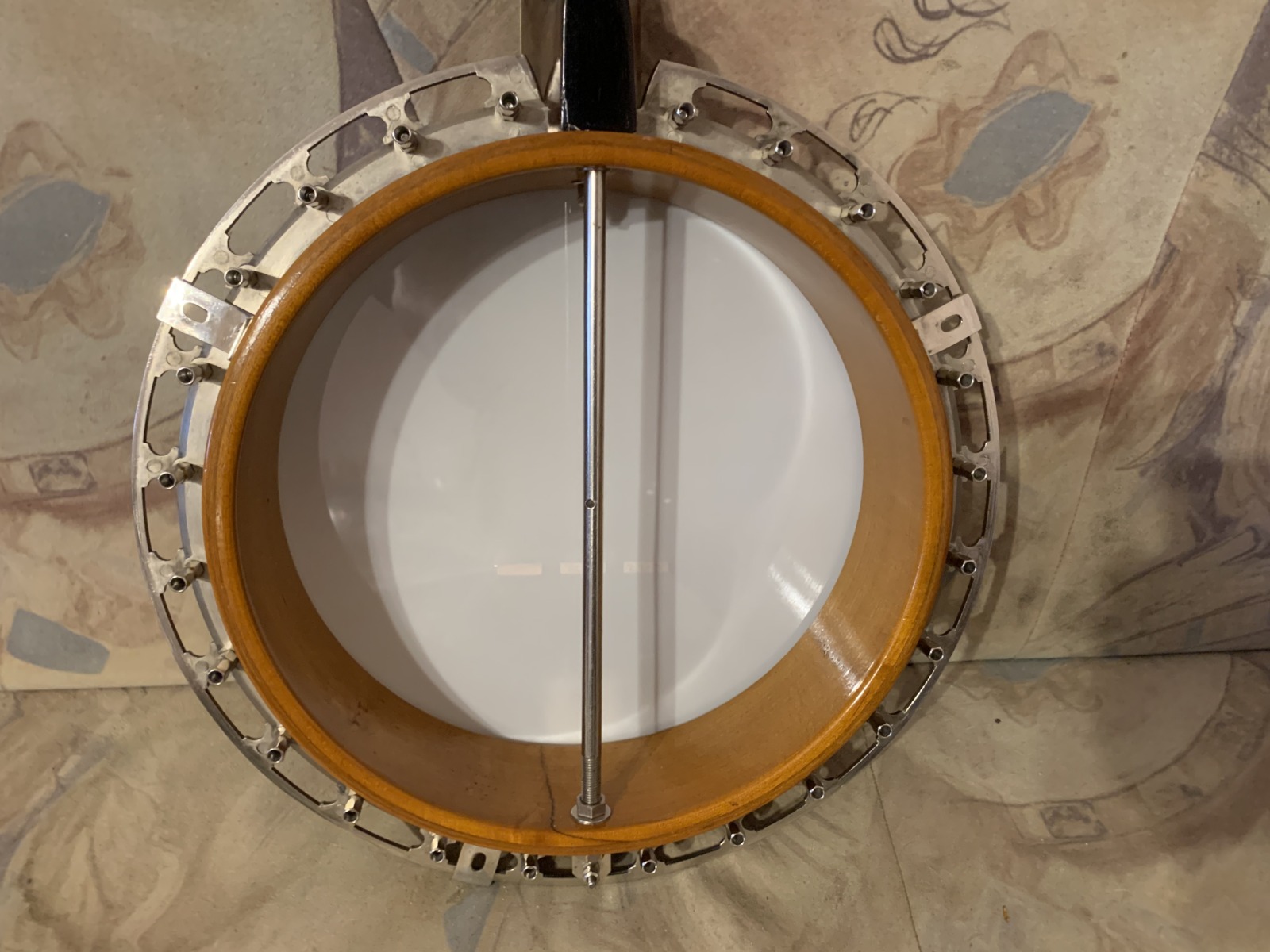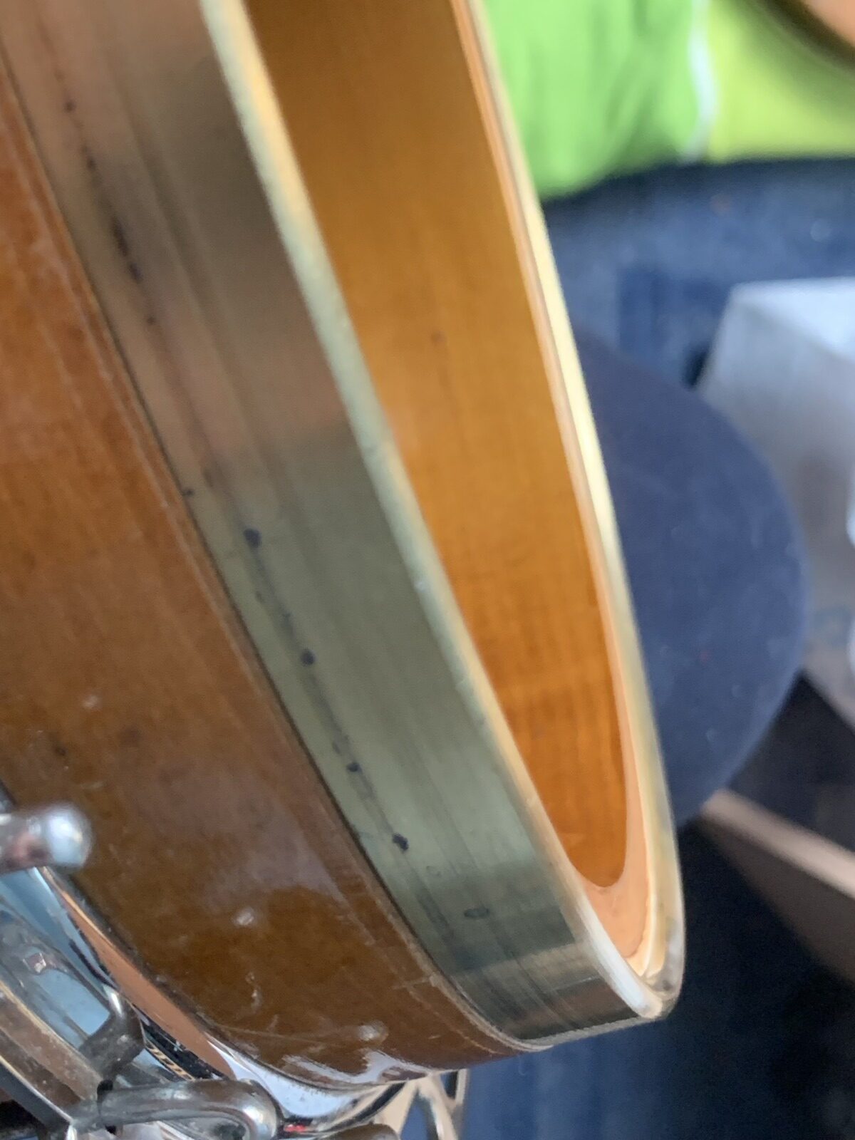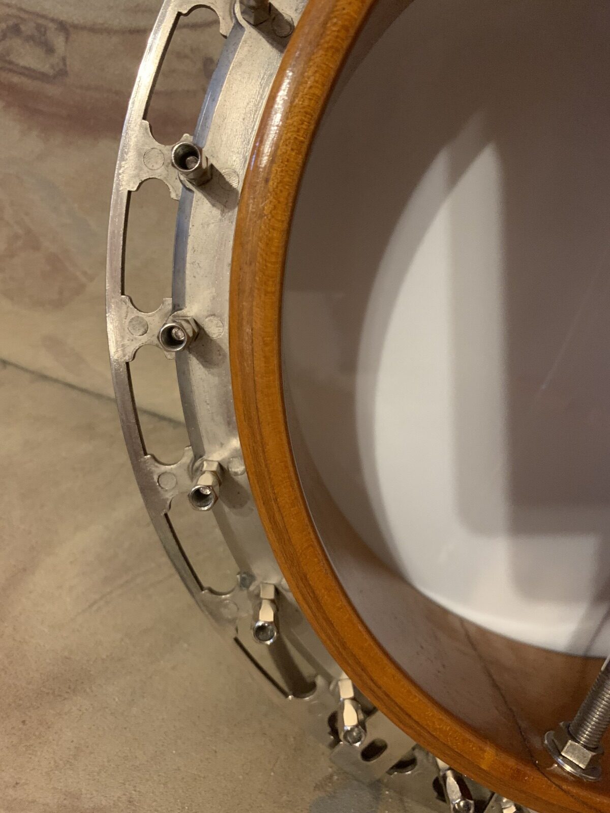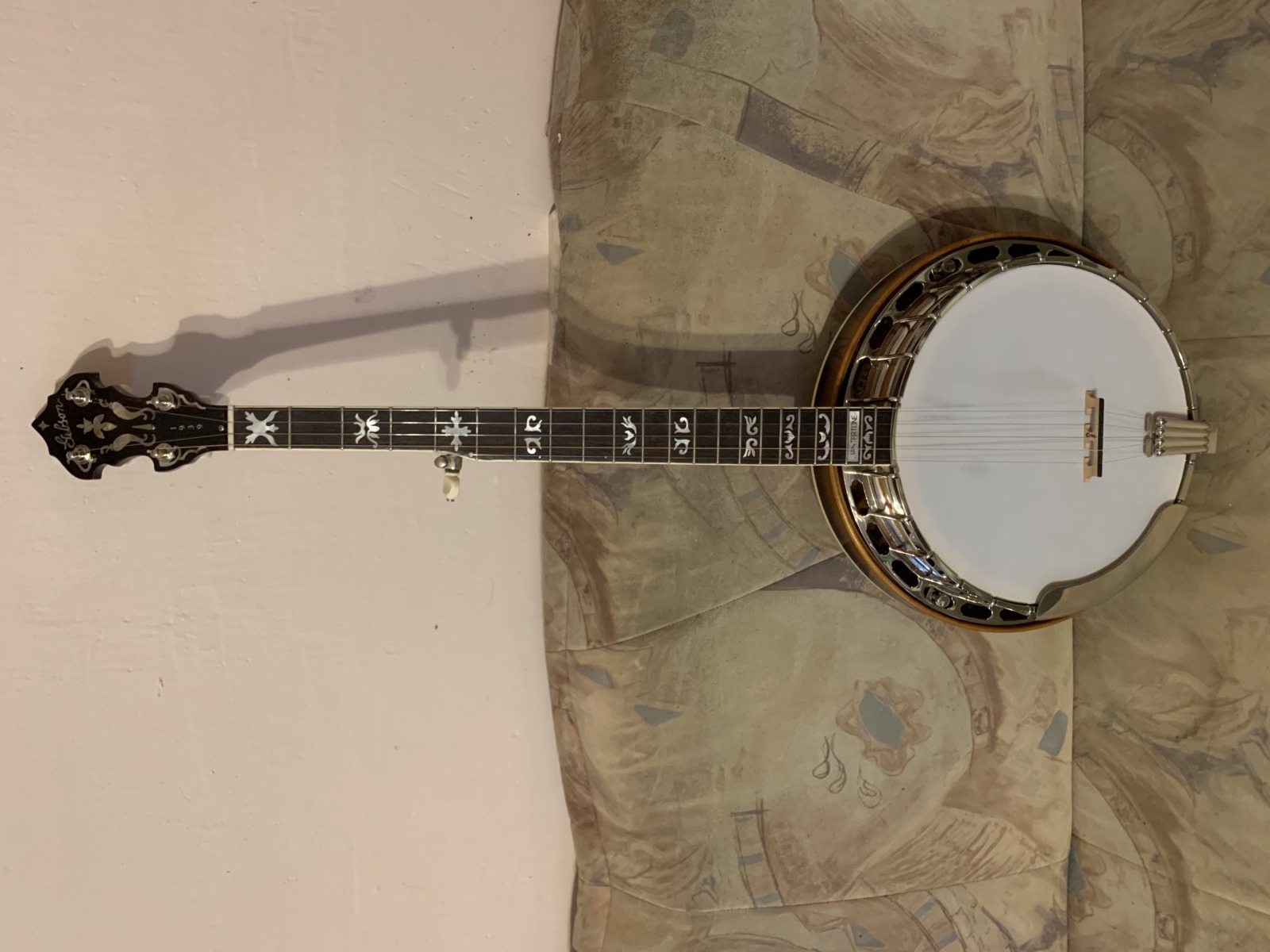 Nabízím k prodeji banjo Gibson RB-00. (Předválečná konverze). Původní přítlačný prstenec blány byl nahrazen modernějším od Zdeňka Roha, což přispělo k lepší stabilitě struníku. (Původní struník na úzkém přítlačném prstenci byl velmi nestabilní). Tonering je Rolled Brass Hoop / tone ring s krátkou“sukní“. (Viz foto). Můstek od Tima Purcella, struník Clamshell, Tvůrce krku je neznámý, ale velmi povedený! Vykládání krku klasické – Flying Eagle…Háčky pro pátou strunu na 7. a 9.  pražci. Blána je Remo Weather King. Ráfek resonátor a flange jsou původní.