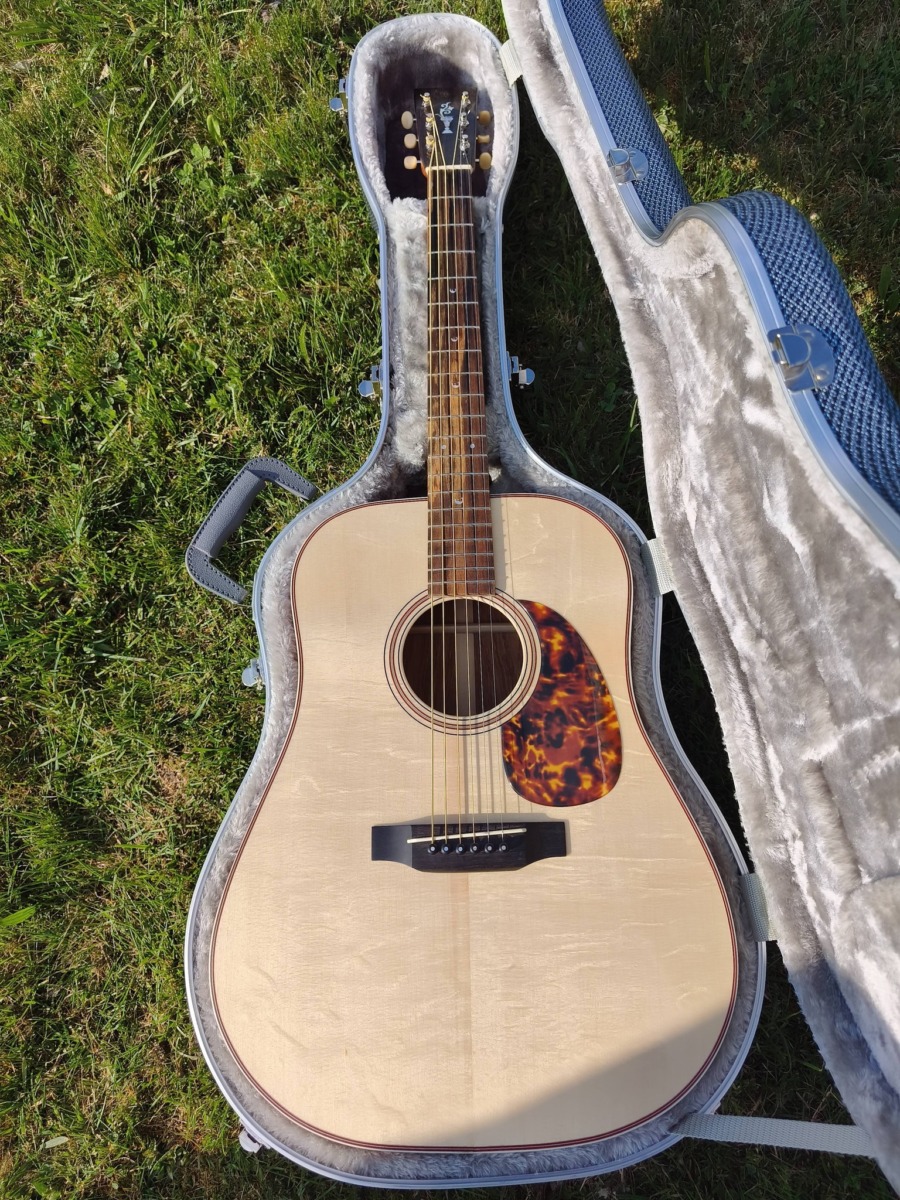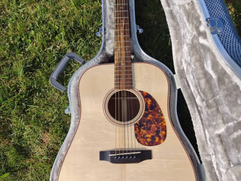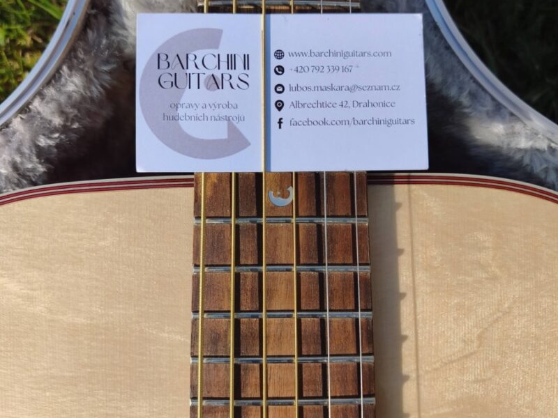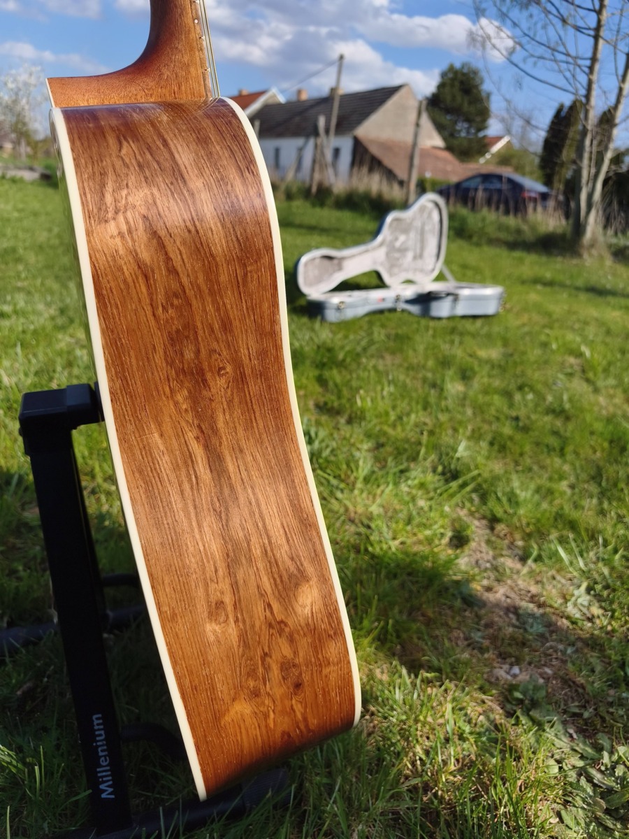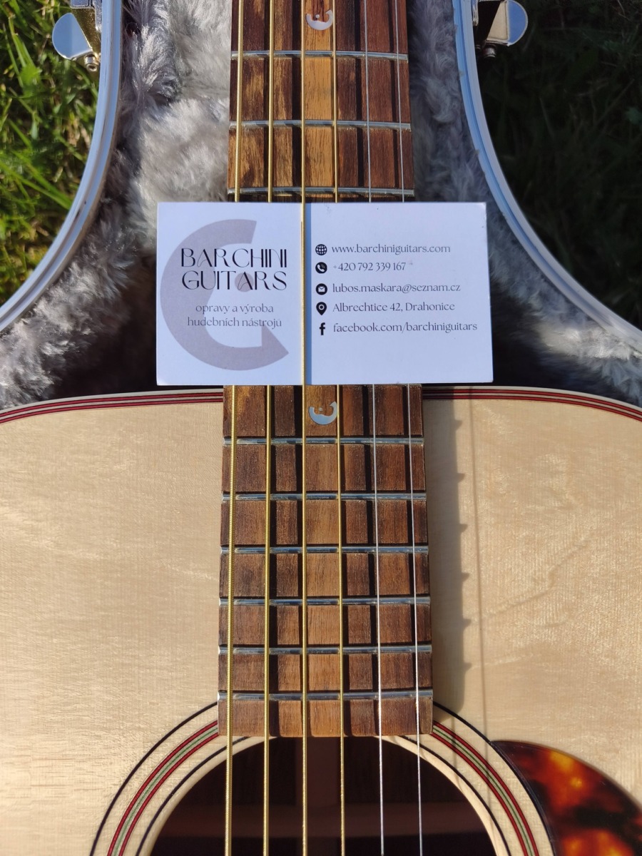 Vrchní deska smrk Engelmann, záda a boky Honduraský palisandr, kobylka a hmatník eben. Kytara je lepená klihem a lak je nitro. Šířka ořechu 43.5 mm. Seřízená na 13ky struny. Lehký kufr v ceně.