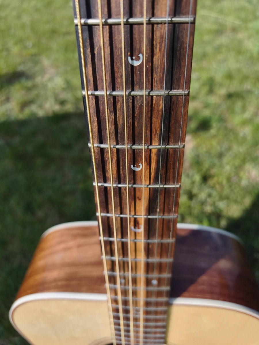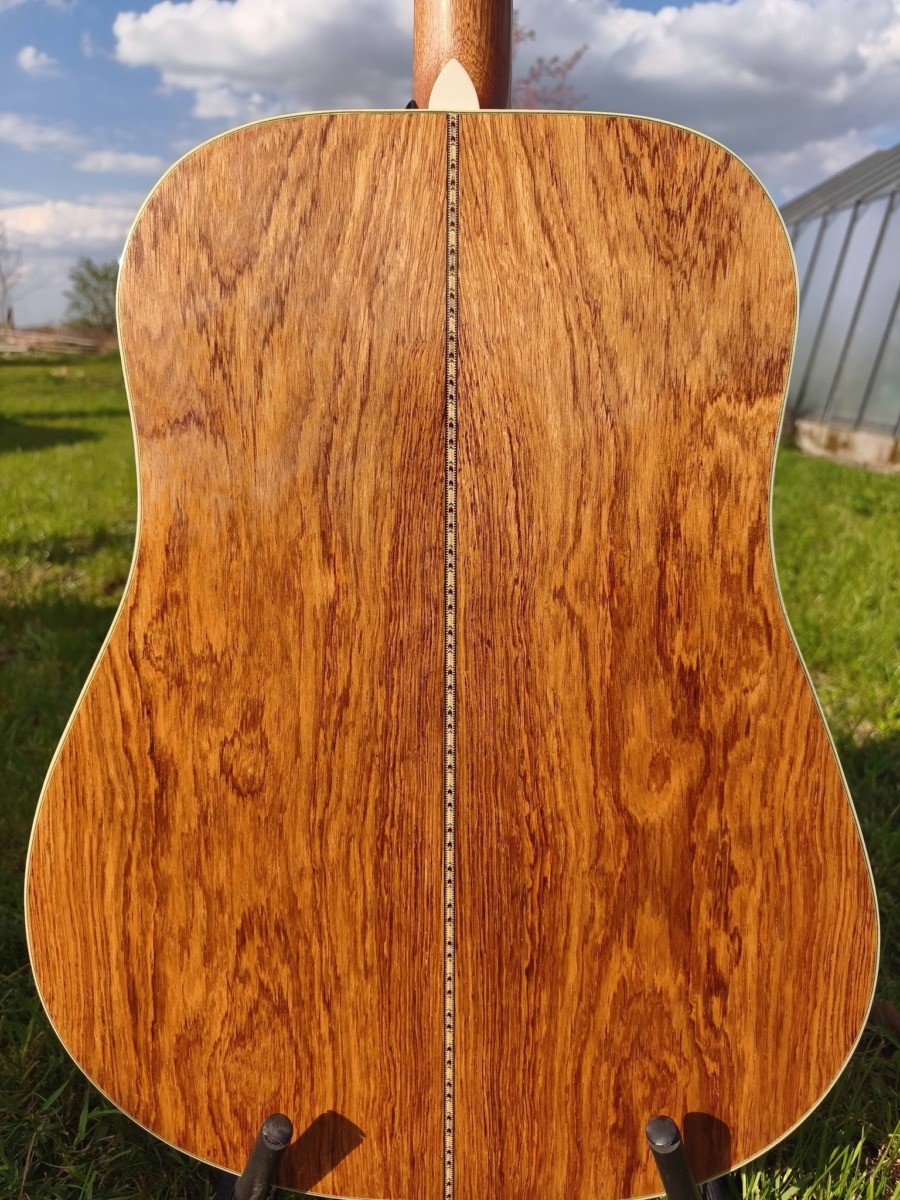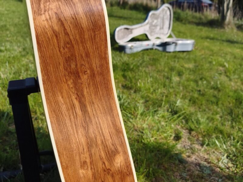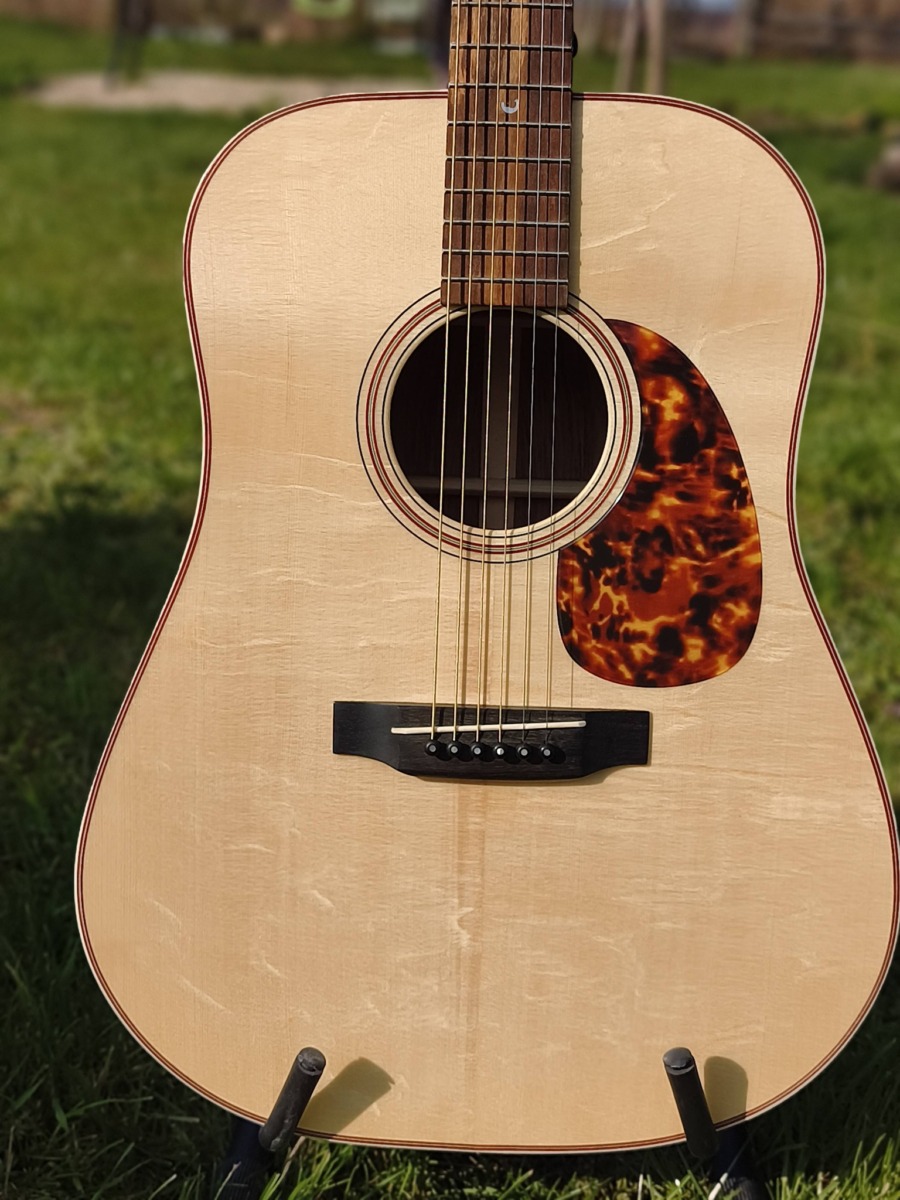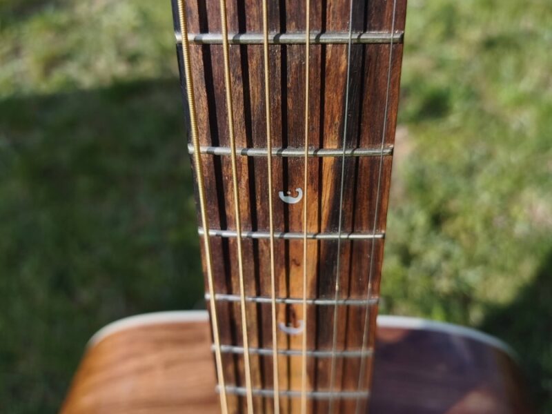 Vrchní deska smrk Engelmann, záda a boky Honduraský palisandr, kobylka a hmatník eben. Kytara je lepená klihem a lak je nitro. Šířka ořechu 43.5 mm. Seřízená na 13ky struny. Lehký kufr v ceně.