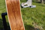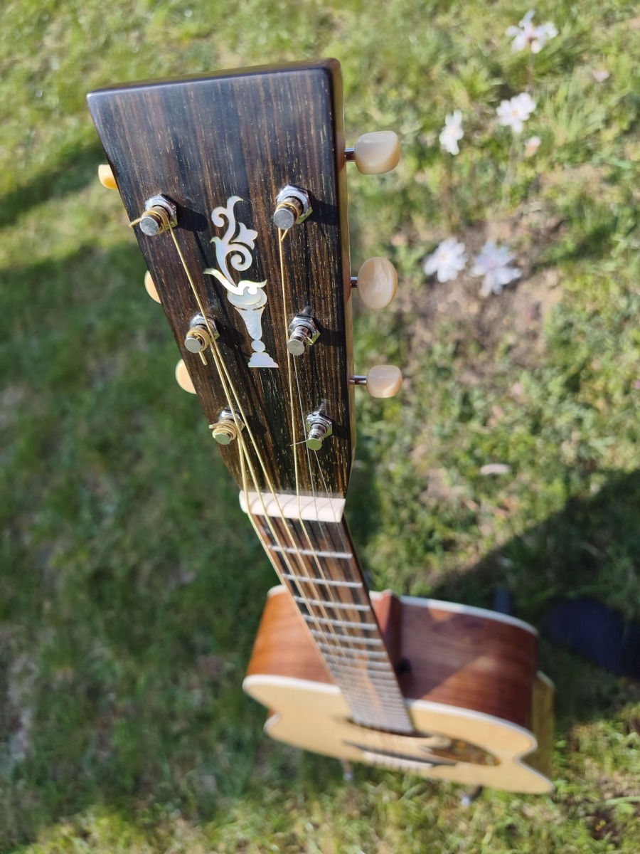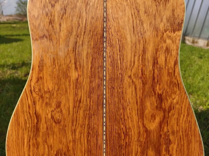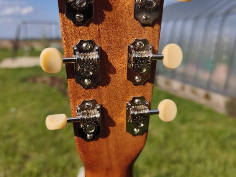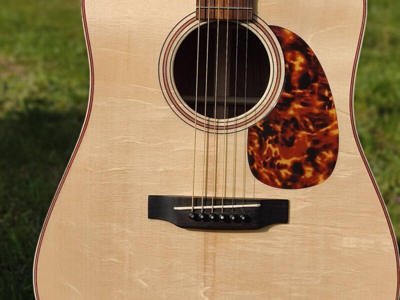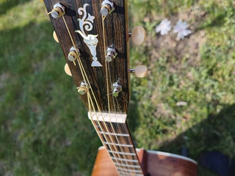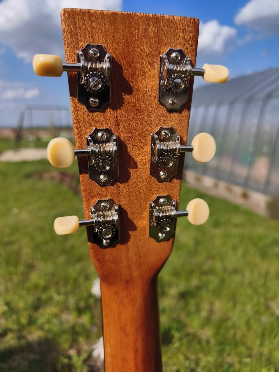 Vrchní deska smrk Engelmann, záda a boky Honduraský palisandr, kobylka a hmatník eben. Kytara je lepená klihem a lak je nitro. Šířka ořechu 43.5 mm. Seřízená na 13ky struny. Lehký kufr v ceně.